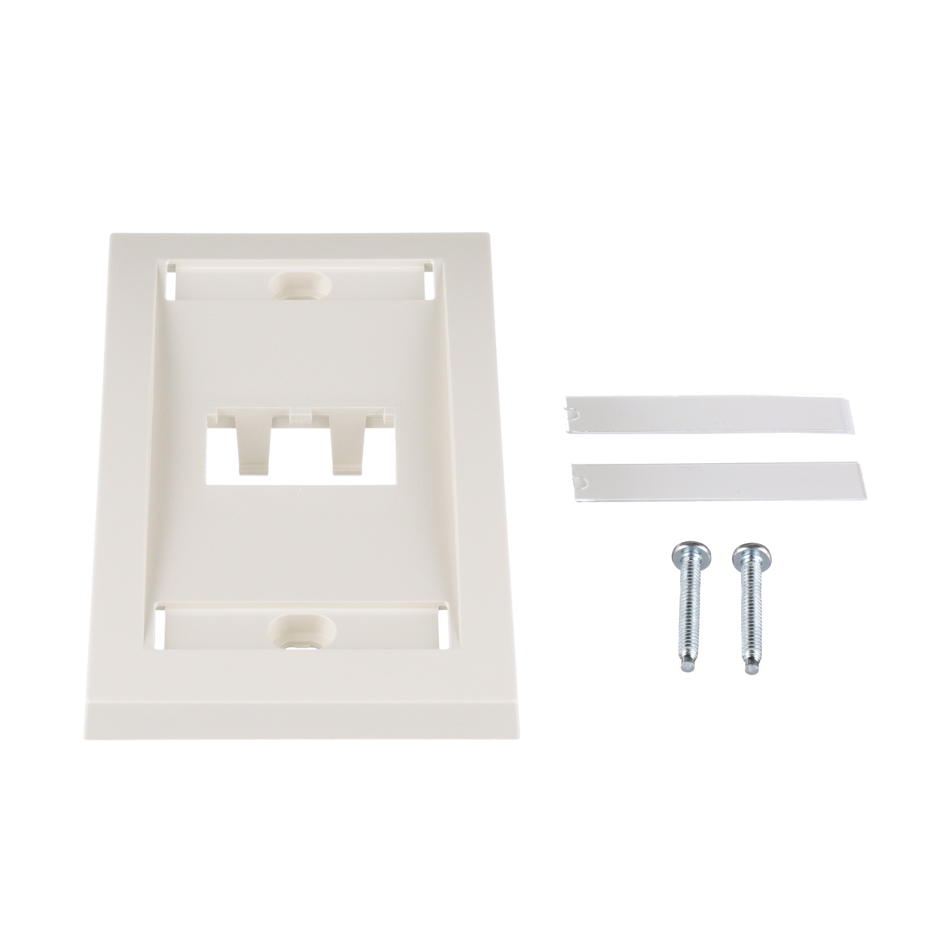 The Mini-Com® Executive Series Faceplate accepts two Mini-Com Modules. The faceplate is single gang and mounts to a NEMA standard single gang opening. The faceplate includes a raised rail design on the outer edge of the frame, has a label pocket for easy identification, and is off white.