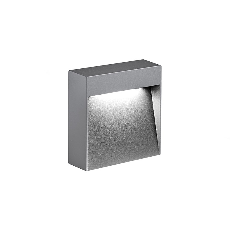 Segnapasso LED a parete per esterno (IP65), adatto anche per pareti in muratura dove non ? possibile inserire un prodotto ad incasso. Struttura in pressofusione di alluminio verniciato con polveri poliestere ad elevata resistenza ai raggi ultraviolet ti e alla corrosione. Fascio di luce direzionatoverso il basso. Disponibile in versione quadrata e rettangolare, tre finiture (bianco, grigio e antracite) e due temperature colore (3000K e 4000K). Disponibili giunti certificati IP68 per la realizzaione delle connessioni elettriche, sicure, durevol i e con barriera anticondensa.