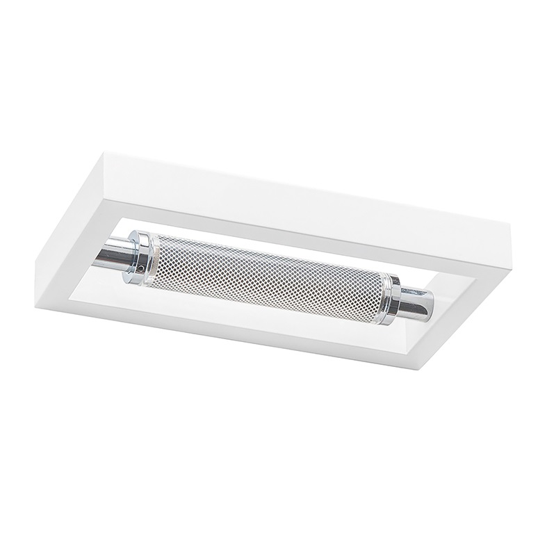 Lampada da parete biemissione con struttura in ottone, proposta in versione cromata, laccata biancao nera. Saldature invisibili, pirex retinato che protegge la sorgente luminosa e impedisce l'abbagliamento. Cablata con attacco R7s che consente di mon tare lampadina LED.