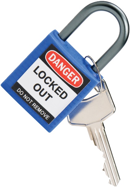Lucchetto per blocco, corpo in nylon e anello in alluminio, 38 mm, blu. Articolo compatto, leggero, resistente alla corrosione e agli urti. Chiave prigioniera fino alla chiusura del lucchetto. Chiave isolata dall'anello. Altri 2 colori disponibili.