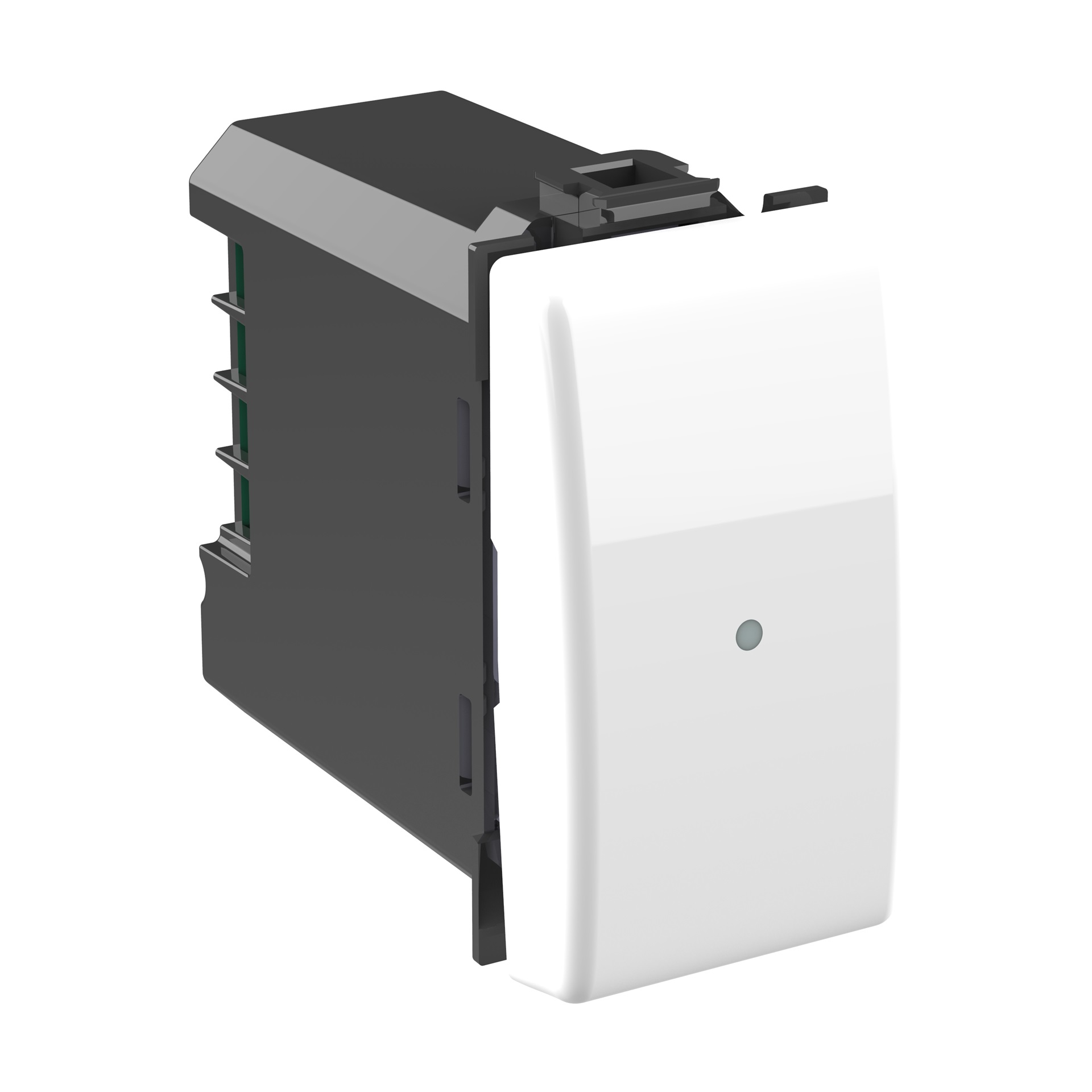 Deviatore connesso. Permette di controllare le luci localmente o da remoto. Si installa come un deviatore tradizionale ed è compatibile con tutti i carichi con potenza massima di 250W. È dotato di un LED blu, configurabile dall’APP HOME + CONTROL, per le funzionalità di localizzazione e stato carico. Può essere associato ad uno o più comandi wireless. Attenzione: è necessaria la connessione al neutro. Alimentazione 110-230Vac - 1 modulo