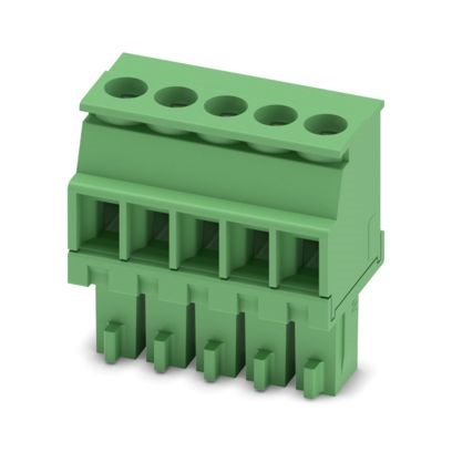 Connettore per circuiti stampati, sezione nominale: 1,5 mm², colore: verde, corrente nominale: 8 A, tensione di dimensionamento (III/2): 160 V, superficie contatti: Sn, tipo di connessione del contatto: Femmina, numero dei potenziali: 5, numero di file: 1, numero poli: 5, numero di connessioni: 5, serie di prodotti: MCVR 1,5/..-ST, passo: 3,5 mm, tipo di connessione: Connessione a vite con gabbia, forma di attacco delle viti: L Fessura longitudinale, direzione di collegamento conduttore/scheda: 90 °, sistema di spine: COMBICON MC 1,5, bloccaggio: assente, tipo di fissaggio: assente, tipo di confezione: confezionato nel cartone