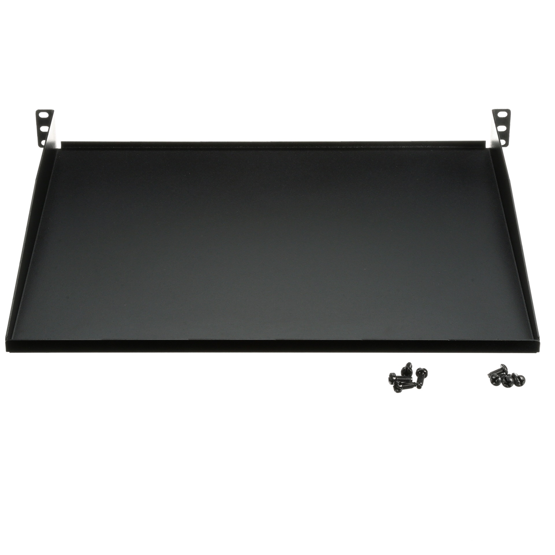 The 2-Post Rack mount shelf mounts test gear, computer equipment, and small networking devices on 3 inch (76mm) or 6 inch (152mm) channel 2-Post Racks. The one-piece steel shelf mounts to the front of EIA racks. It is 1 RU with a 45 pound load capacity, and is black.