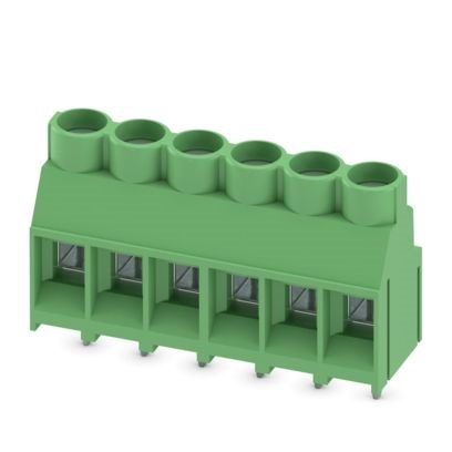 Morsetto circuito stampato, corrente nominale: 32 A, tensione di dimensionamento (III/2): 630 V, sezione nominale: 4 mm², numero dei potenziali: 6, numero di file: 1, numero di poli per fila: 6, serie di prodotti: MKDS 5, passo: 6,35 mm, tipo di connessione: Connessione a vite con gabbia, forma di attacco delle viti: L Fessura longitudinale, montaggio: Saldatura a onde, direzione di collegamento conduttore/scheda: 0 °, colore: verde, Layout Pin: Pinning lineare, Lunghezza pin [P]: 5,1 mm, numero di pin di saldatura per potenziale: 1, tipo di confezione: confezionato nel cartone