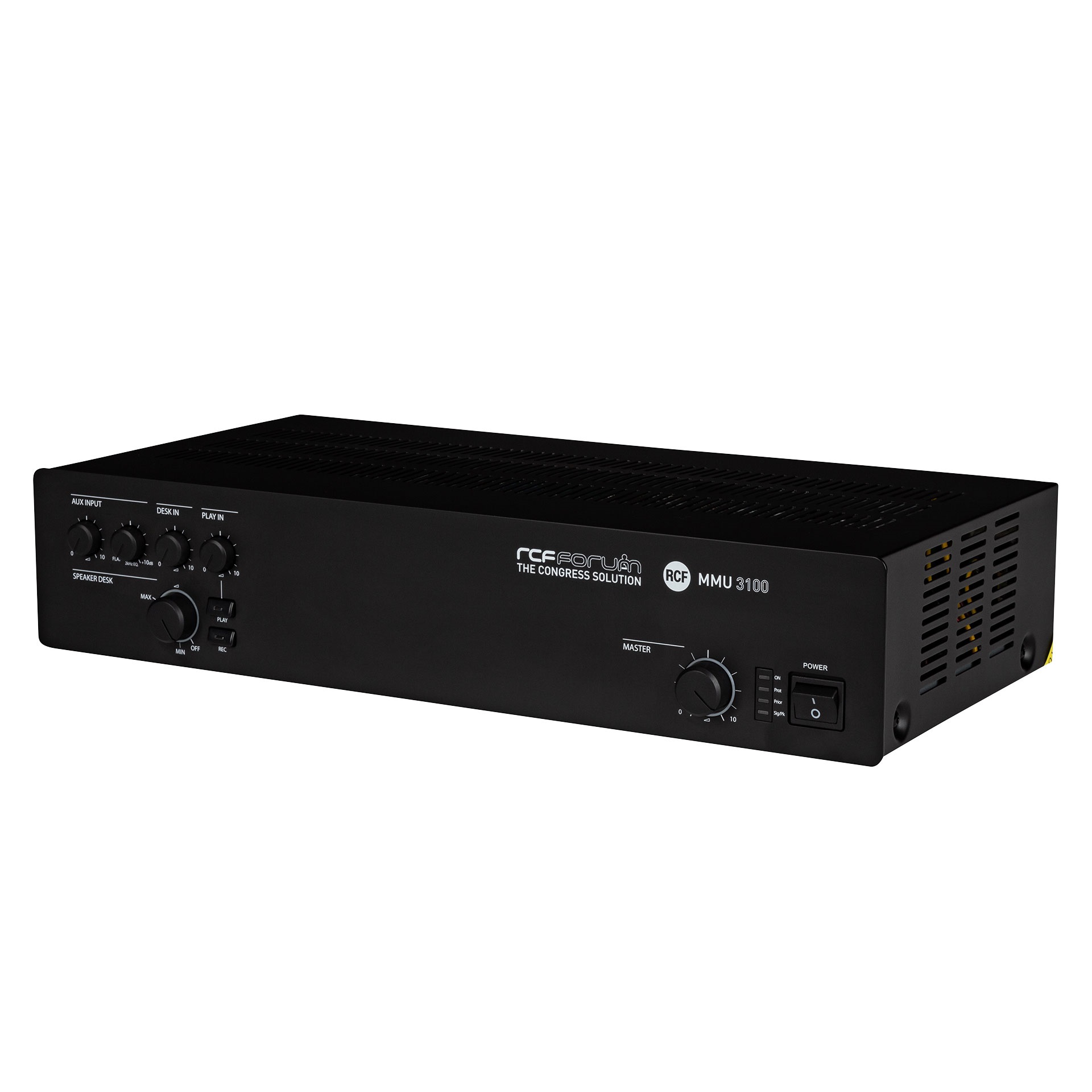 L’unità centrale MMU 3100 include tutte le caratteristiche necessarie per il set-up di una conferenza con un massimo di 80 partecipanti. È dotata anche di una uscita per la registrazione e di un ingrasso playback, insieme ad un ingresso e un’uscita dedicati per l’interfacciamento con il sistema di teleconferenza. L'unità è in grado di fornire 80W sull’sua uscita a 100V o 70V per il collegamento di diffusori per la sonorizzazione dell’ambiente. Un’uscita a livello linea è disponibile anche per il collegamento ad un sistema di amplificazione indipendente. I controlli utente sono sul pannello frontale e comprendono livelli di volume per gli ingressi e le uscite amplificate, diretti ai diffusori integrati in ogni console microfonica ed a quelli collegati all'uscita dell'amplificatore. Infine, due MMU 3100 possono essere collegate tramite una porta dedicata, per espandere il numero dei microfoni delegati a 160.