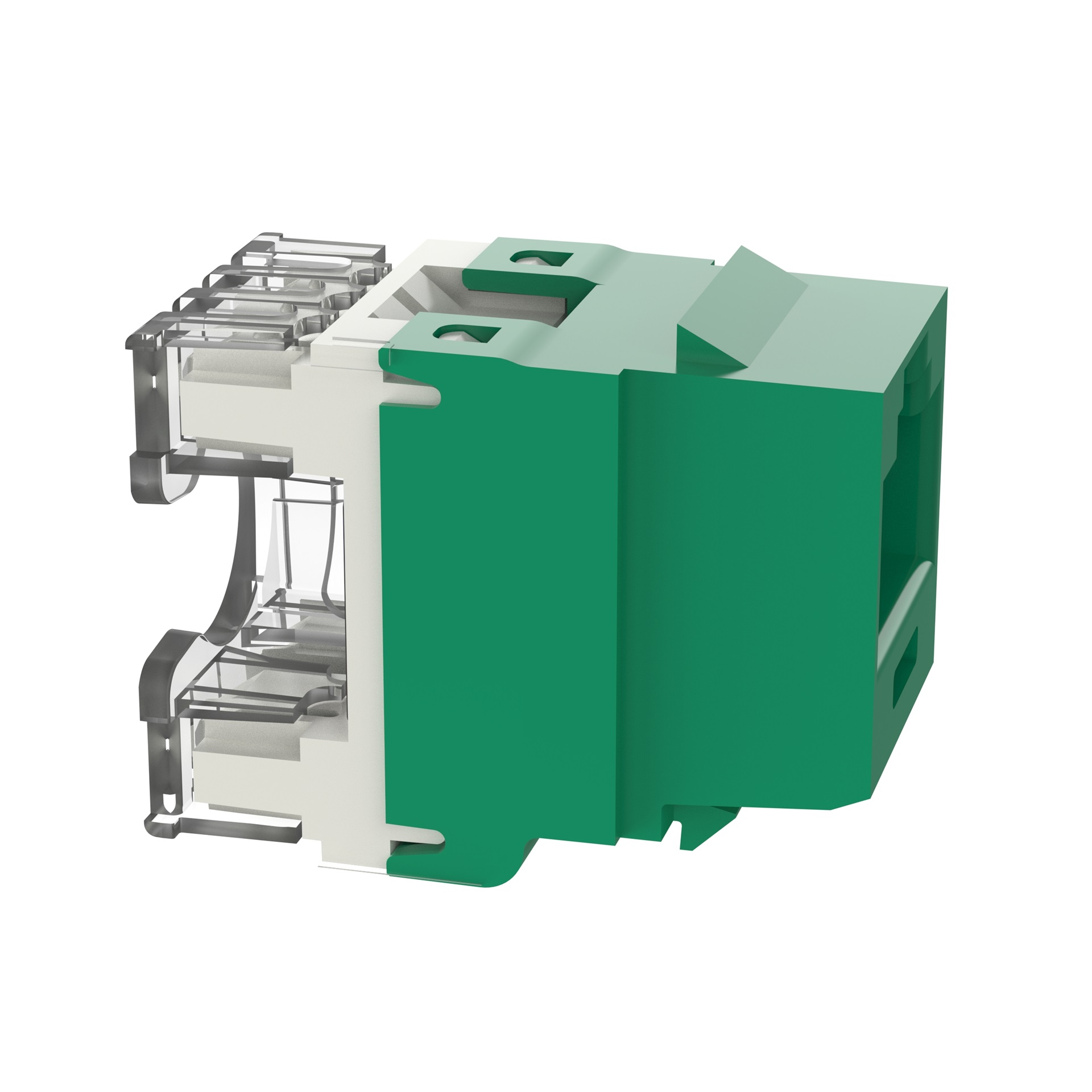 The NetKey® Cat 6 UTP RJ45 Punchdown Keystone Jack Module is designed to terminate 4-pair, 22-26 AWG twisted pair cable. Each module is 100% factory tested to exceed industry standard performance requirements. Contacts are plated with 50 microinches of gold for superior performance. Jacks are individually serialized, and are compatible with keystone interfaces such as NetKey® Faceplates, Modular Patch Panels, and Surface Mount Boxes. The module is green.