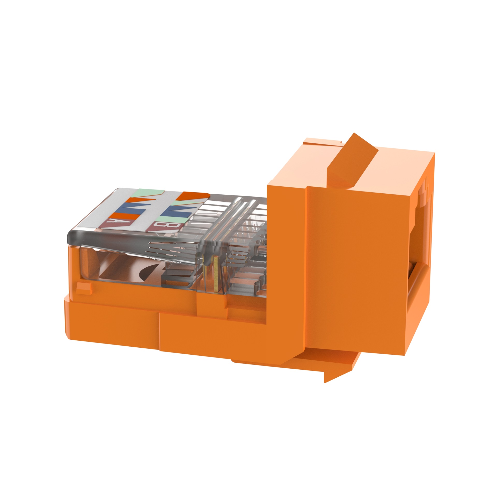 The NetKey® Cat 5e UTP RJ45 Leadframe Keystone Jack Module is designed to terminate 4-pair, 22-24 AWG twisted pair cable. Each module is 100% factory tested for continuity. Contacts are plated with 50 microinches of gold for superior performance. Jack modules are compatible with keystone interfaces including NetKey Faceplates, Modular Patch Panels, and Surface Mount Boxes. This jack module is orange.