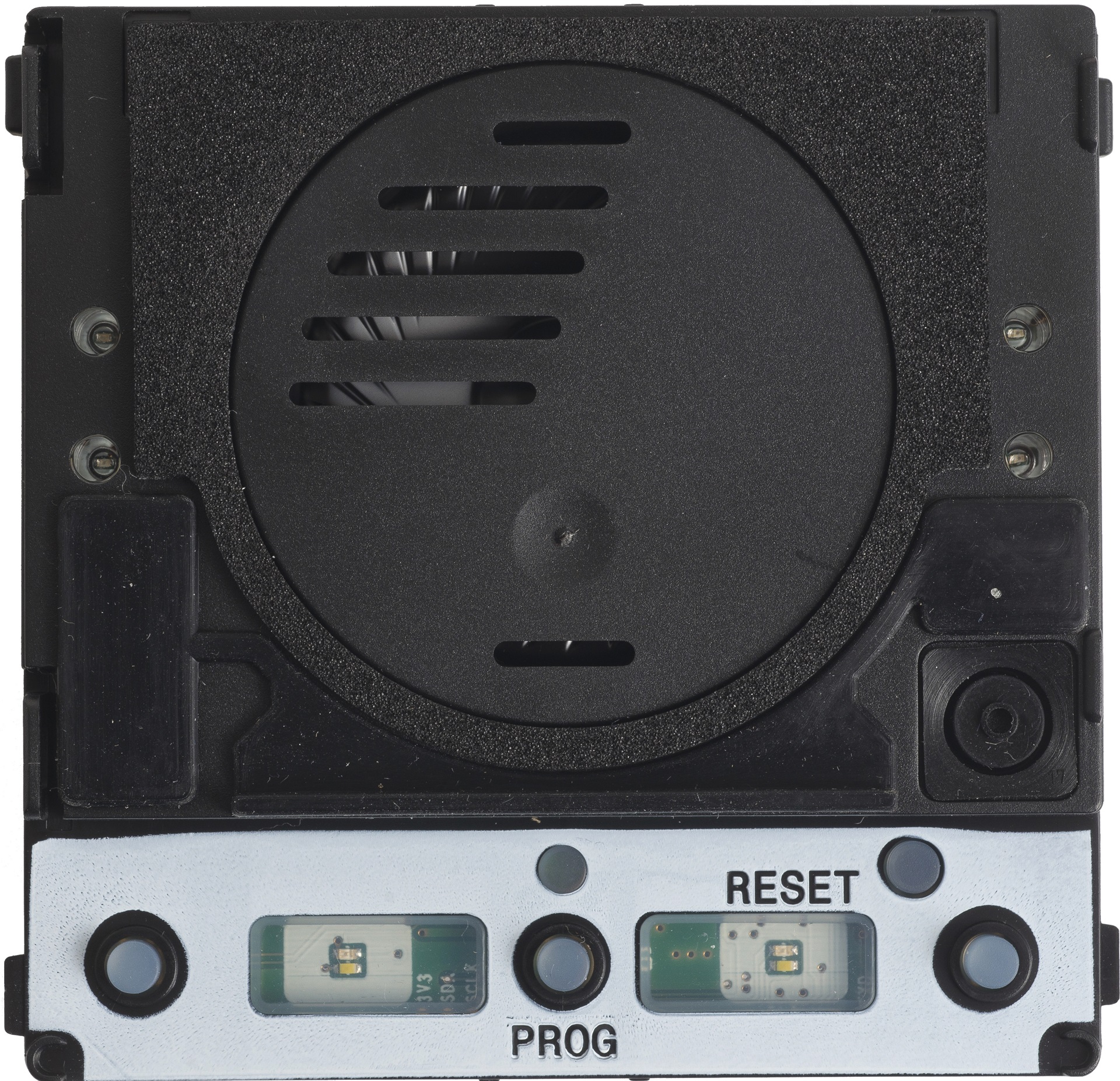 Modulo elettronico con corpo in tecnopolimero e 2 pulsanti di chiamata con doppia retroilluminazione portacartellini blu o bianca. Dotato di comando locale per elettroserratura, contatto ausiliario (1A, 30V max), ingressi per pulsante apriporta e per la segnalazione dello stato della porta (I/O programmabile), uscita per l’attivazione di telecamere esterne (I/O programmabile). Provvisto di ingresso video telecamera analogica esterna. Sulla parte frontale è dotato di LED per le segnalazioni visive dello stato dell’impianto. Regolazione del volume audio del microfono e dell’altoparlante e del tempo di attivazione dell’elettroserratura. Programmazione manuale oppure da PC attraverso il connettore MINI USB frontale. Da completare con frontale citofonico. Combinato con il relativo frontale garantisce un grado di protezione acqua e polveri IP54.