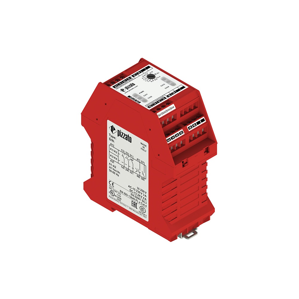 Modulo di sicurezza (2NO+1NC) istantanei + 2NO ritardati, categoria 4, Funzioni: Controllo ripari e arresti di emergenza, Categoria 4/3, PL e, SIL 3, uscite (2NO+1NC) + (2NO ritardate alla diseccitazione), (CS AT-0), Terminali: Morsetti a vite, Alimentazione: 24 Vac/dc.