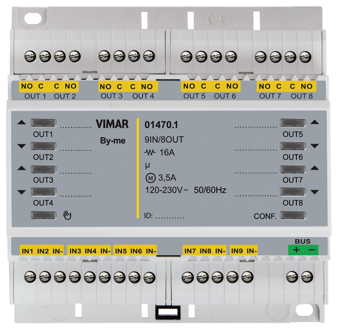 Modulo con 9 ingressi e 8 uscite preprogrammate per applicazioni residenziali o alberghiere, ingressi digitali programmabili per contatti privi di potenziale, uscite a relè NO 16 A 120-230 V~ 50/60 Hz programmabili con funzione comando luci, tapparelle con orientamento delle lamelle, pulsanti per comando locale, domotica By-me, installazione su guida DIN (60715 TH35), occupa 6 moduli da 17,5 mm