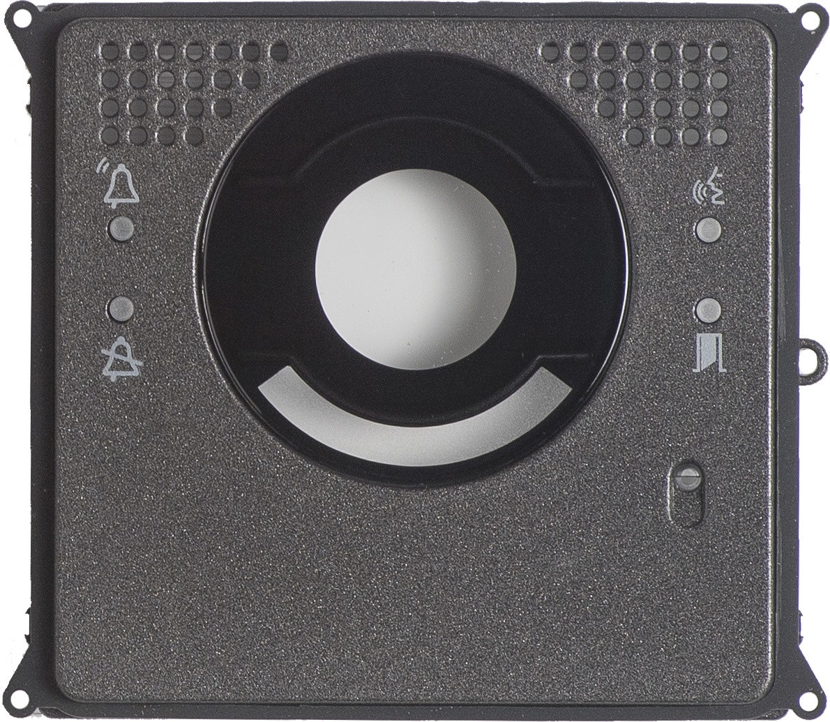 Completo di supporto in policarbonato, è dotato di pittogrammi per la segnalazione dello stato dell'impianto. Da abbinare a un modulo videocitofonico. Grado di protezione agli urti IK09.