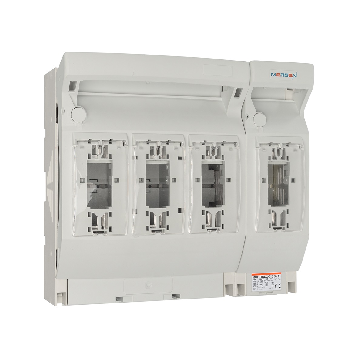 The production programme of MULTIBLOC® series 1.ST8 comprises NH fuse switch disconnectors for 250A. They are designed for bottom fitting/panel installation and are available in single pole, double pole, tiple pole and quadruple pole units. For installation of MULTIBLOC® NH fuse switch disconnectors in distribution units with central cover, respective covers are used to obtain a uniform profile in height and length. MULTIBLOC® size 1 are designed for NH fuse-links in accordance with IEC/EN 60269-2, VDE 0636-2, size 1, 250A. MULTIBLOC® offers the user the possibility of fast and easy installation as well as a high degree of security during installation and maintenance.