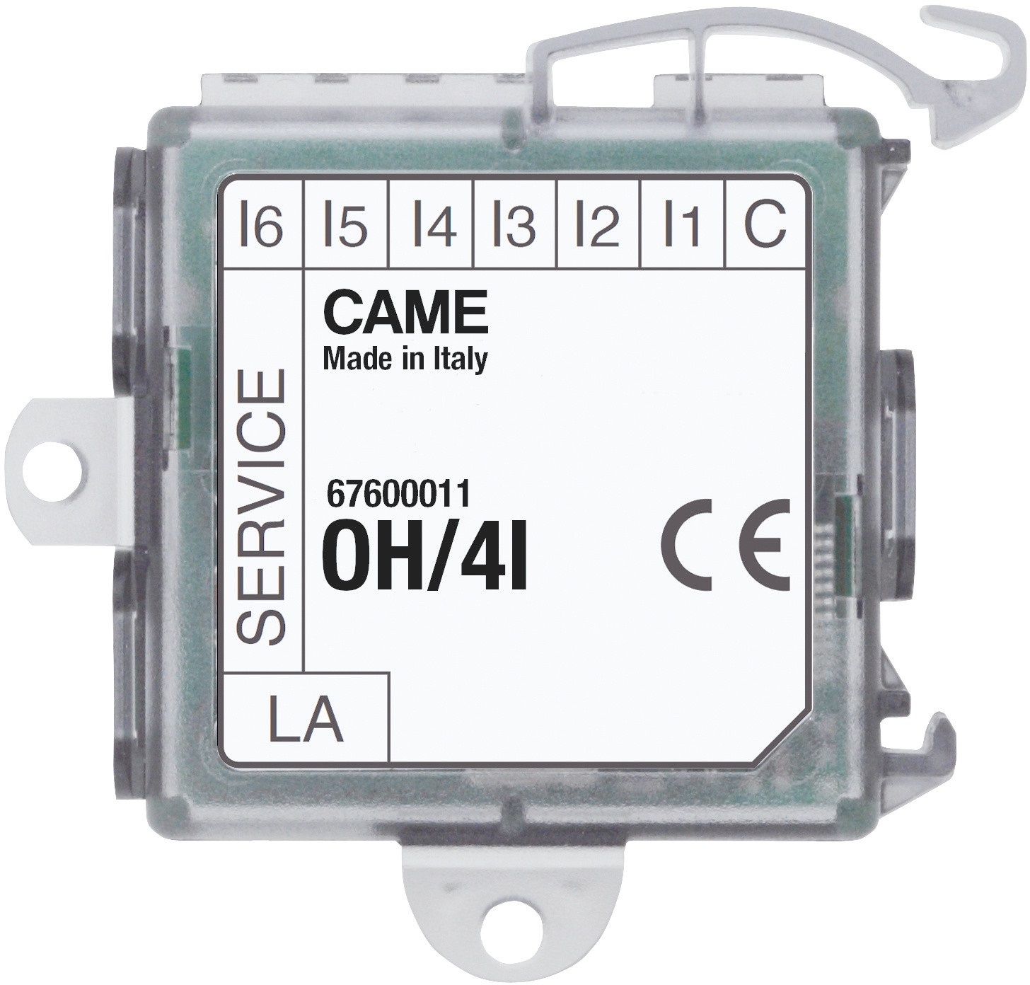 Dispone di 4 ingressi per il collegamento di dispositivi di comando (pulsanti o contatti di uscita rivelatori) e 4 uscite di tipo O.C. per il collegamento di LED di segnalazione, da abbinare ad uscite del sistema per avere un riscontro visivo sullo stato del carico controllato. Il contenitore permette l’installazione da quadro su guida DIN o da incasso su fondo scatola.