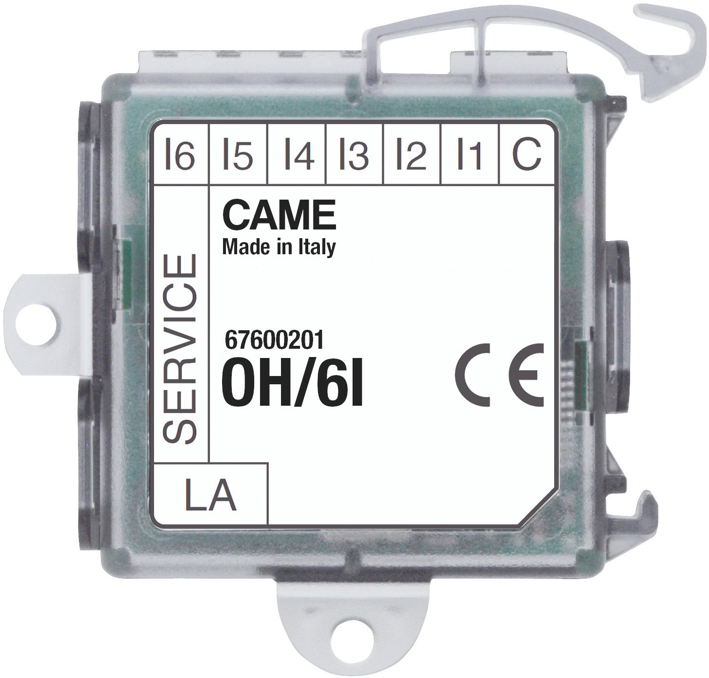Dispone di 6 ingressi digitali per il collegamento di dispositivi di comando (pulsanti o contatti di uscita rivelatori). Il contenitore permette l’installazione da quadro su guida DIN o da incasso su fondo scatola.