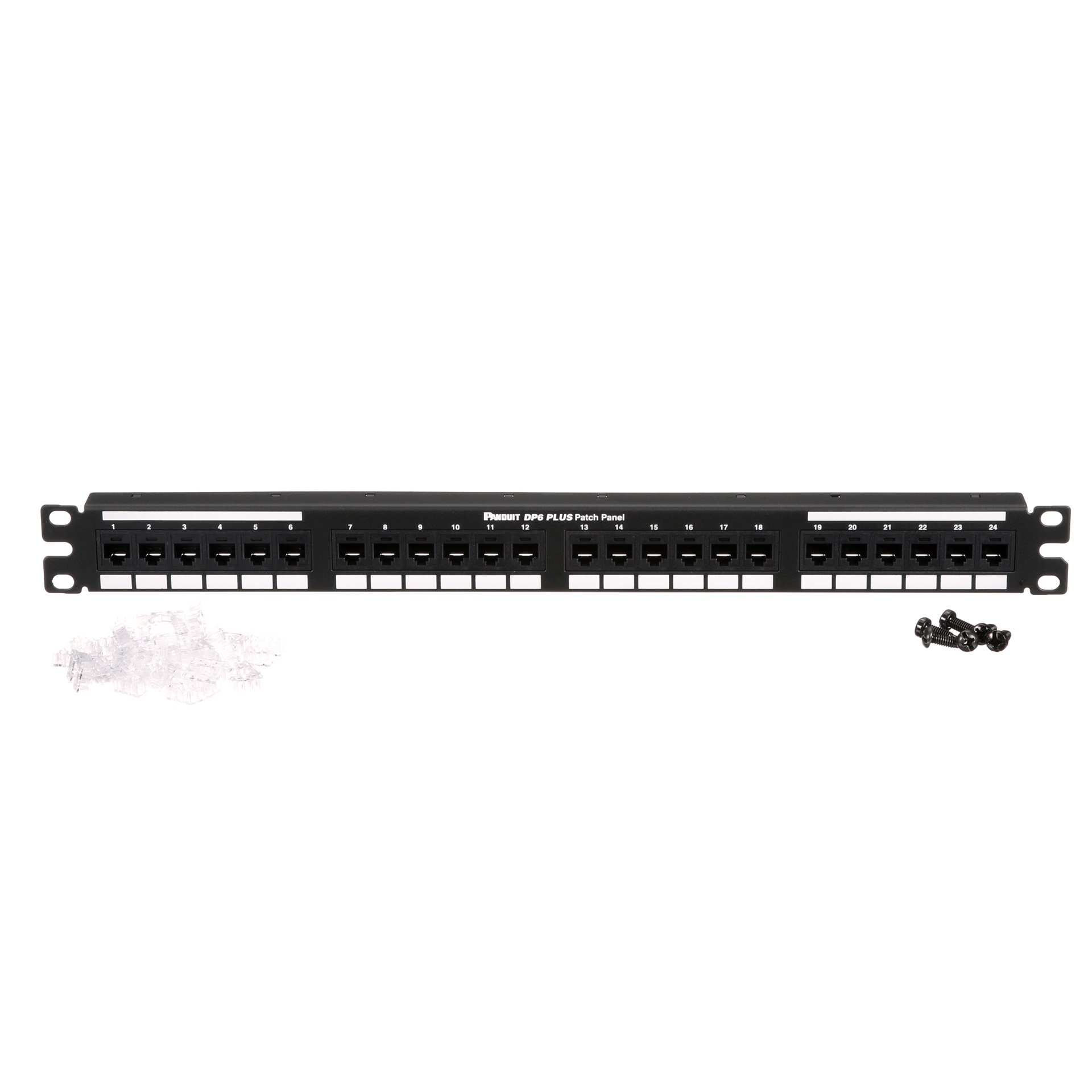 The DP6™ PLUS Flat Cat 6 Punchdown Patch Panel terminates 4-pair, 22–26 AWG, 100 ohm unshielded twisted pair cable with an industry standard single wire 110 punchdown tool. The Cat 6 patch panels mount to 19 inch and 23 inch racks and include 24 ports. Each module is 100% factory tested to exceed industry standard performance requirements and is individually serialized for traceability. The panel includes space for labeling. This punchdown patch panel is 1 RU, made of steel, and is black.