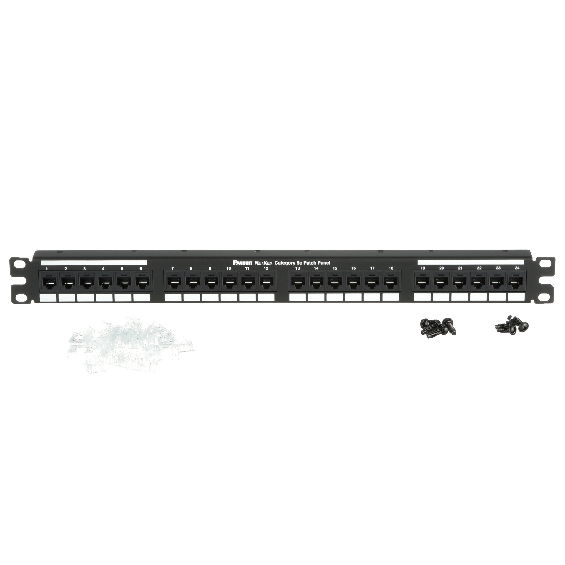 The NetKey® Flat Punchdown Keystone Patch Panel terminates 4-pair, 22–26 AWG, 100-ohm twisted pair cable. These Cat 5e patch panels mount to 19" and 23" racks and incudes 24 ports. The RJ45 interface provides a quick plug and play connection to RJ45 patch cords. This punchdown patch panel is 1 RU, made of steel and is black.