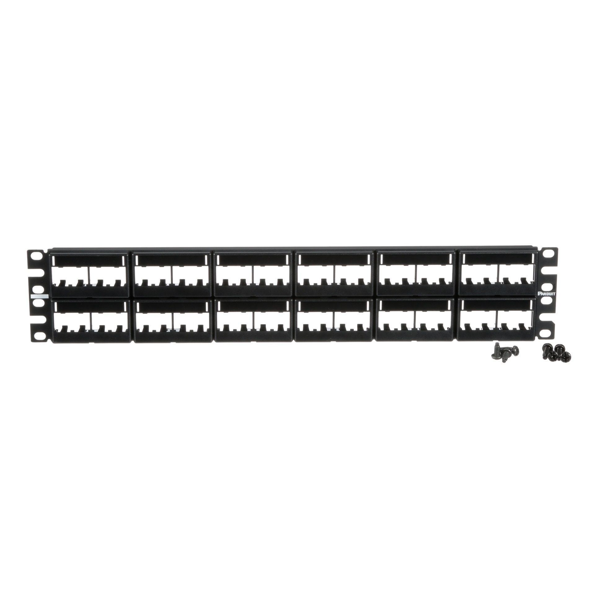 The Mini-Com® Faceplate Modular Patch Panel accepts up to 48 Mini-Com Modules for unshielded applications in 2 RU and mounts to 19 inch and 23 inch racks and cabinets. The panel offers front access, includes label pockets for easy identification, and is black.