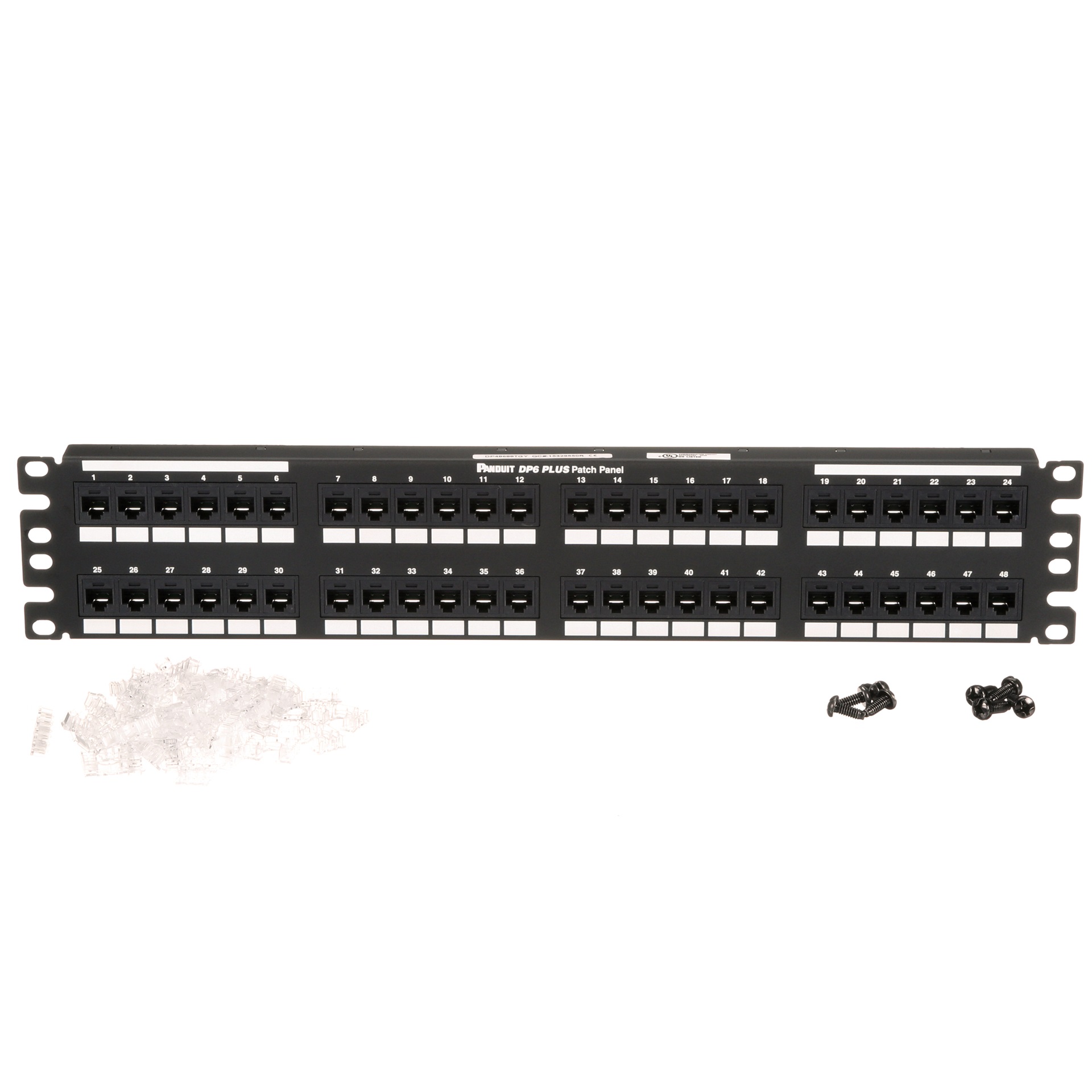 The DP6™ PLUS Flat Cat 6 Punchdown Patch Panel terminates 4-pair, 22–26 AWG, 100 ohm unshielded twisted pair cable with an industry standard single wire 110 punchdown tool. The Cat 6 patch panels mount to 19 inch and 23 inch racks and include 48 ports. Each module is 100% factory tested to exceed industry standard performance requirements and is individually serialized for traceability. The panel includes space for labeling. This punchdown patch panel is 2 RU, made of steel, and is black.