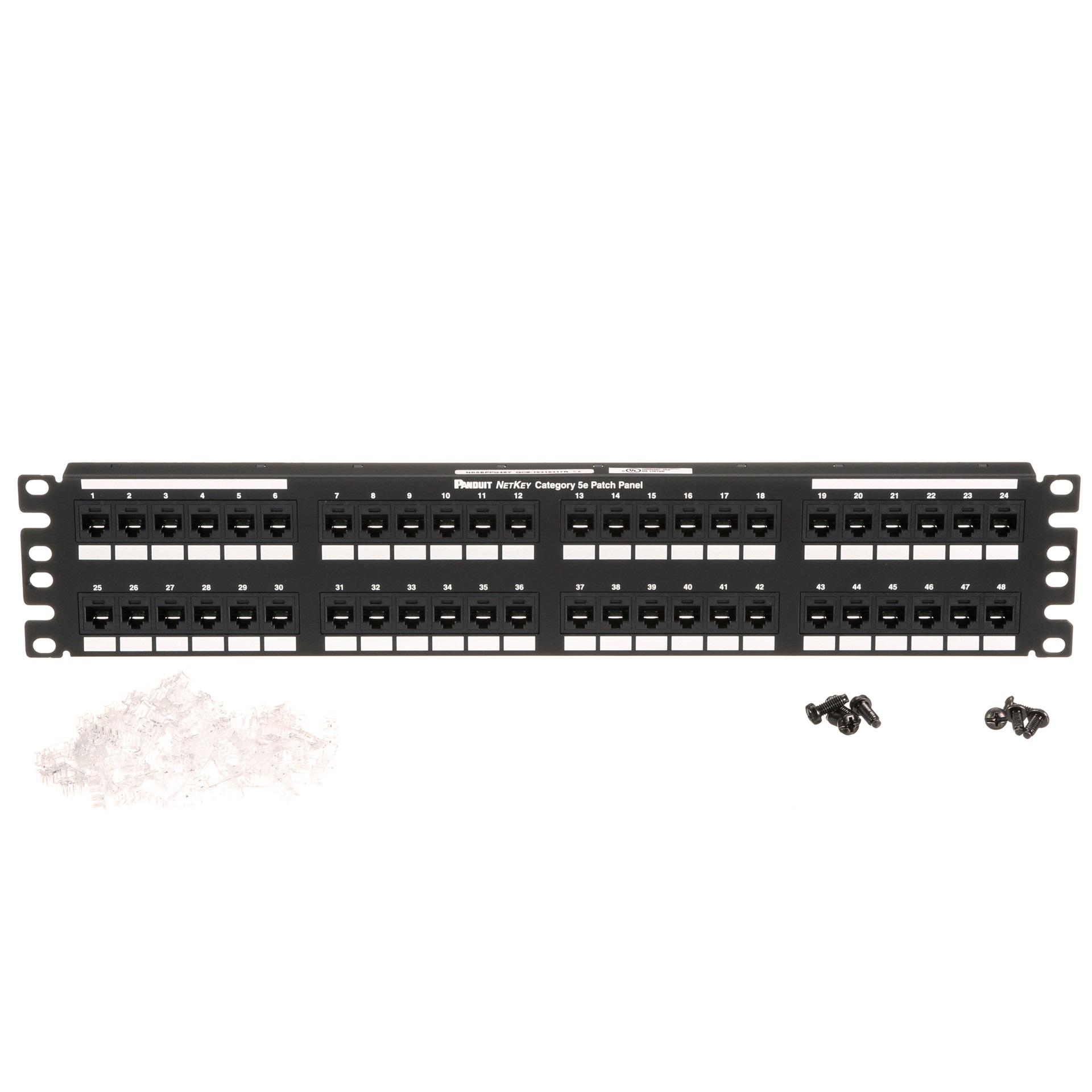The NetKey® Flat Punchdown Keystone Patch Panel terminates 4-pair, 22–26 AWG, 100-ohm twisted pair cable. These Cat 5e patch panels mount to 19" and 23" racks and incudes 48 ports. The RJ45 interface provides a quick plug and play connection to RJ45 patch cords. This punchdown patch panel is 2 RU, made of steel and is black.
