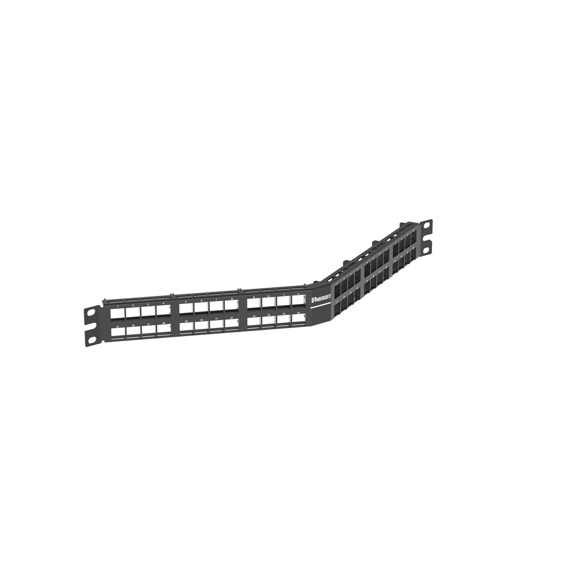 The NetKey High Density Angled Modular Patch Panel accepts up to 48 keystone modules for unshielded applications in 1 RU and mounts to 19 inch and 23 inch racks and cabinets. The patch panel is black.