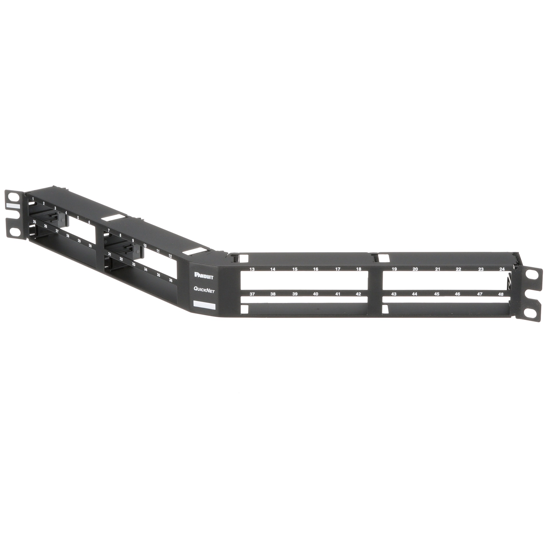 The QuickNet™ Angled Patch Panel accepts QuickNet Pre-Terminated Cassettes and Patch Panel Adapters. These high-density patch panels conserve valuable rack space and, due to the angle, they facilitate proper bend radius control and minimize the need for horizontal cable managers. The patch panel is 48 port in 1 RU and black.