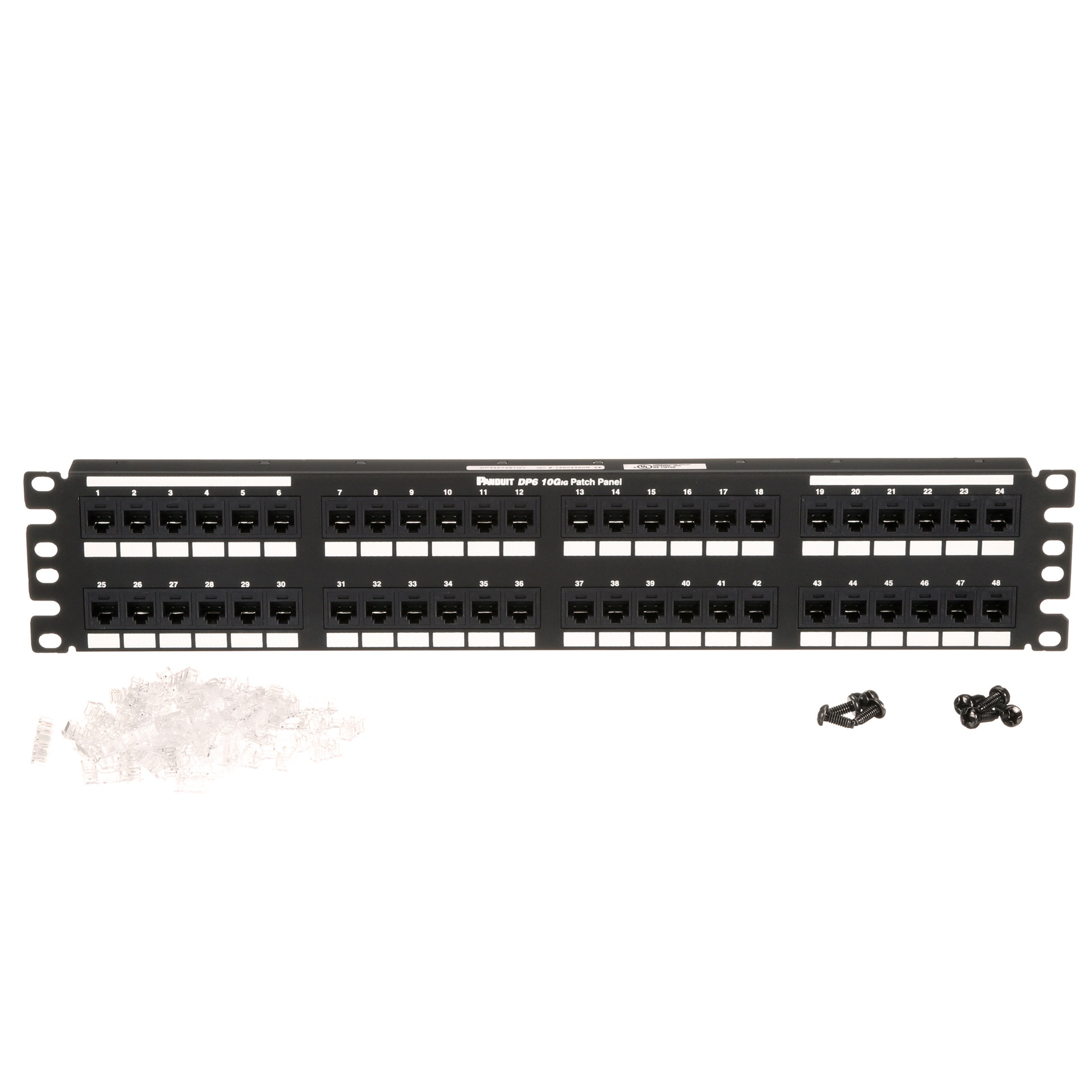 The DP6A™ PLUS Flat Cat 6A Punchdown Patch Panel terminates 4-pair, 22–26 AWG, 100 ohm unshielded twisted pair cable with an industry standard single wire 110 punchdown tool. The Cat 6A patch panels mount to 19 inch and 23 inch racks and include 48 ports. Each module is 100% factory tested to exceed industry standard performance requirements and is individually serialized for traceability. The panel includes space for labeling. This punchdown patch panel is 2 RU, made of steel, and is black.
