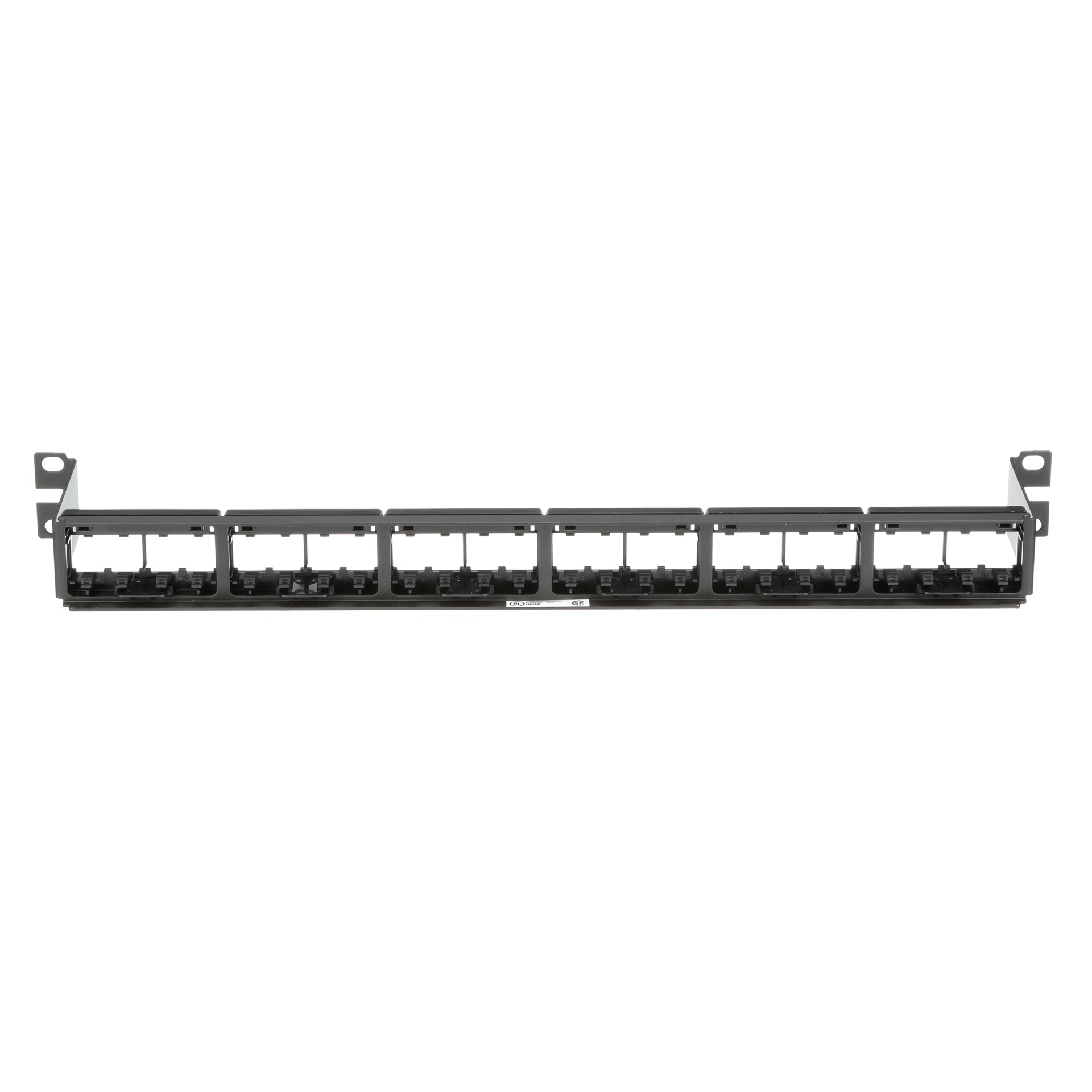 The Mini-Com® Faceplate Recessed Modular Patch Panel accepts up to 24 Mini-Com Modules for unshielded applications in 1 RU and mounts to 19 inch racks and cabinets. The patch panel offers front access, includes label pockets for easy identification, and is black.