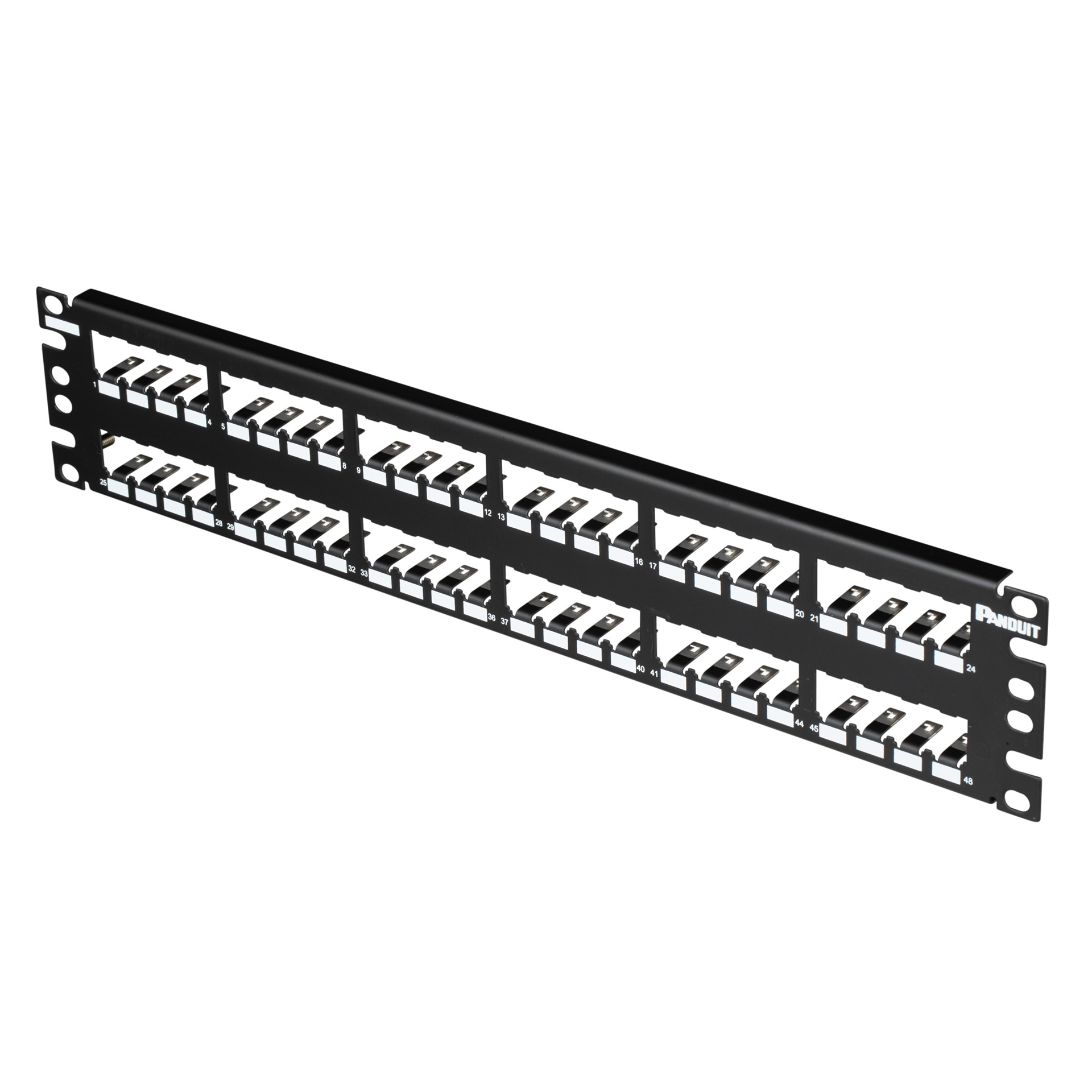 The Mini-Com® All Metal Shielded Patch Panel accepts up to 48 Mini-Com Shielded Jack Modules in 2 RU. The panel has a flat design made of stainless steel construction and mounts to 19 inch and 23 inch racks and cabinets. It includes grounding lugs. The panel has white write-on areas, can be identified with adhesive labels, and is black.