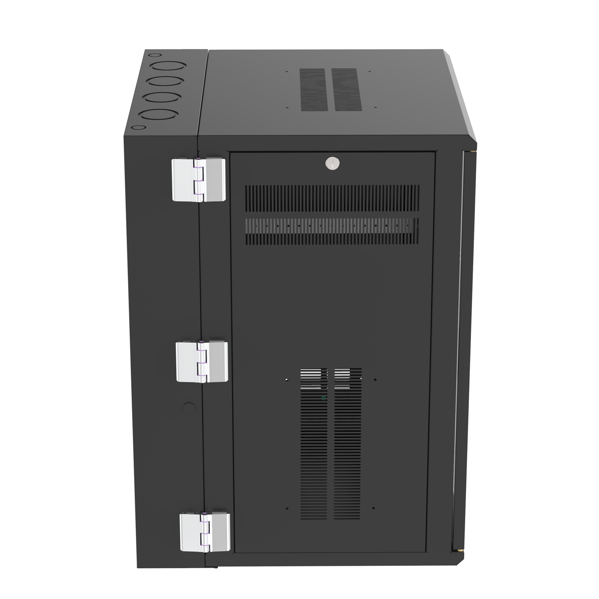 The PanZone Wall Mount Cabinet with windowed door is 25 inches deep and includes hinged doors on the front and back for complete access to networking equipment to make moves, adds, and changes easy. The removable side panels allow for access to cable routing. The enclosure is engineered to allow proper climate control for use with various networking equipment. The 18 RU enclosure is rated to 300 pounds and is black.
