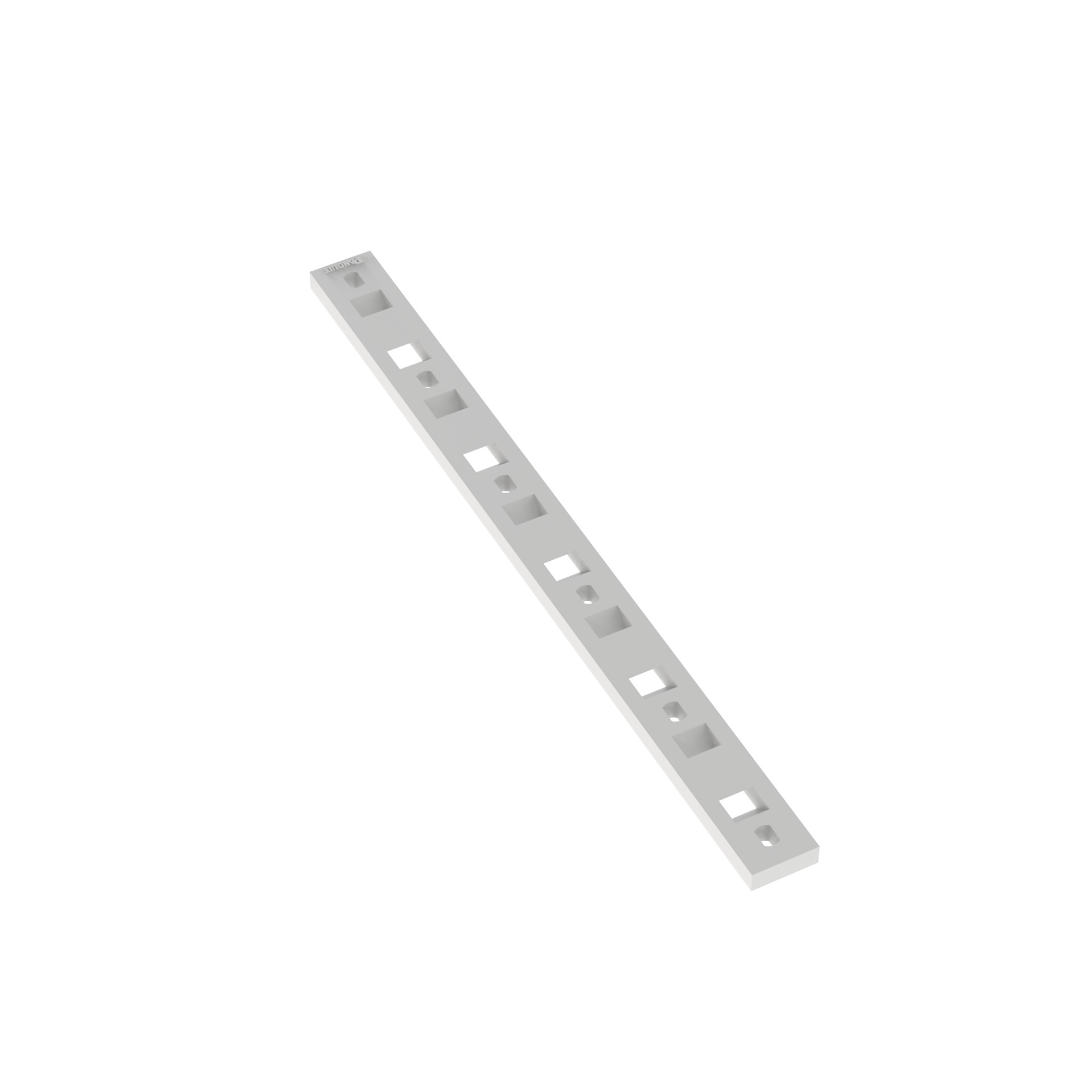 The multiple tie plate in natural color supports five bundles and is used with miniature, intermediate, and standard cable ties. It uses #6 (M3) screws and is made of nylon 6.6, which increases mechanical strength, heat and wear resistance, and stiffness. It is designed for indoor environments and comes in packages of 100.