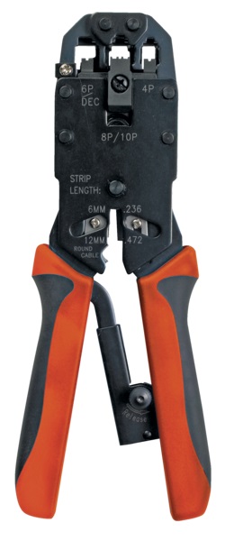 Pinza crimpatrice per connettori RJ45, RJ11 et RJ12, munita di cricchetto. È in grado di tagliare e di spellare cavi, ed è ideale per crimpare connettori modulari con 4, 6 e 8 contatti RJ45, RJ11 et RJ12. Manico bimateriale.