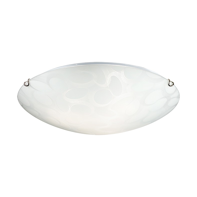Lampada a sospensione, a soffitto in vetro curvato bianco satinato, con serigrafie che creano un gioco di trasparenze, facendo emergere una trama a cerchi concentrici. Particolari in metallo cromato per la versione a soffitto, cavo di sospensione e rosone bianchi per la versione a sospensione. Attac co E27 che consente di montare lampadine LED.