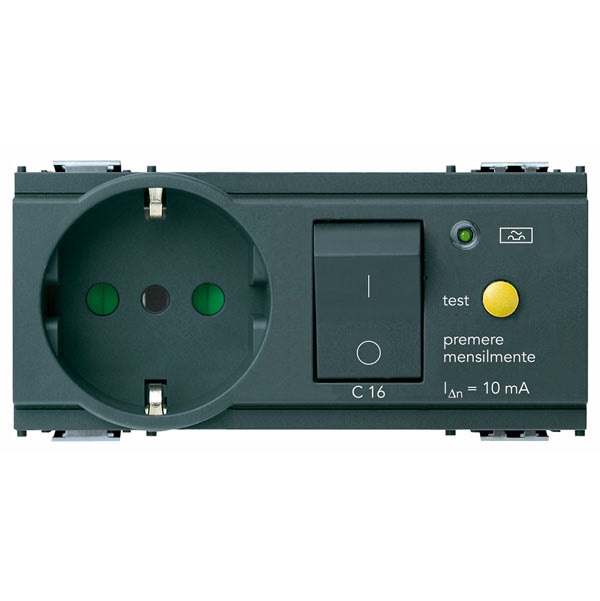 Presa SICURY 2P+T 16 A standard italiano tipo P30 (contatti di terra laterali e centrale), interbloccata con interruttore automatico magnetotermico differenziale 1P+N C 16, 230 V~ 50 Hz, IΔn 10 mA, p.i. 3000 A, grigio - 4 moduli