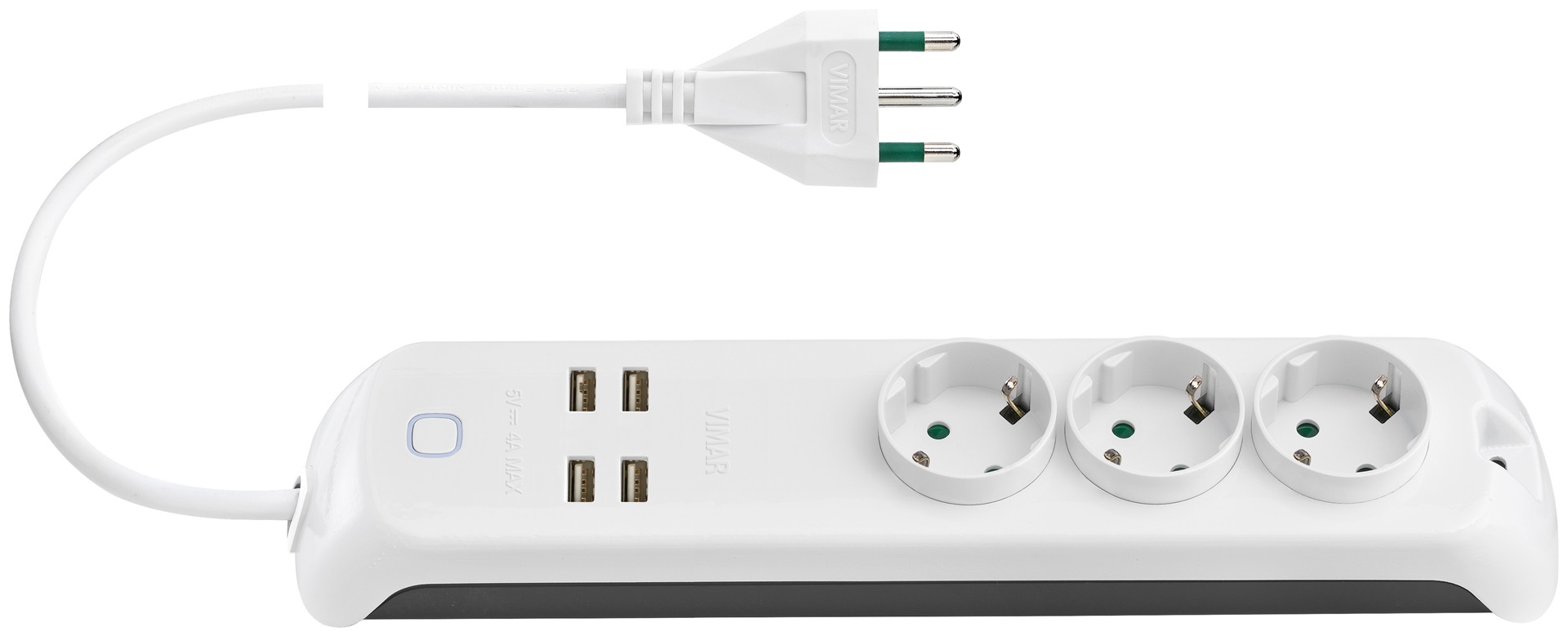Presa mobile multipla 2P+T 16 A 250 V~, 3 uscite SICURY standard tedesco, alimentatore USB 12 W 2,4 A 5 V con 4 uscite USB tipo A ottimizzate per caricare contemporaneamente 4 dispositivi (es. tablet, smartphone), interruttore luminoso, controllo locale o da remoto mediante App, cavo da 1,5 m con 3 conduttori da 1,5 mm2 (3G1,5), spina 2P+T 16 A standard italiano tipo S17, bianco
