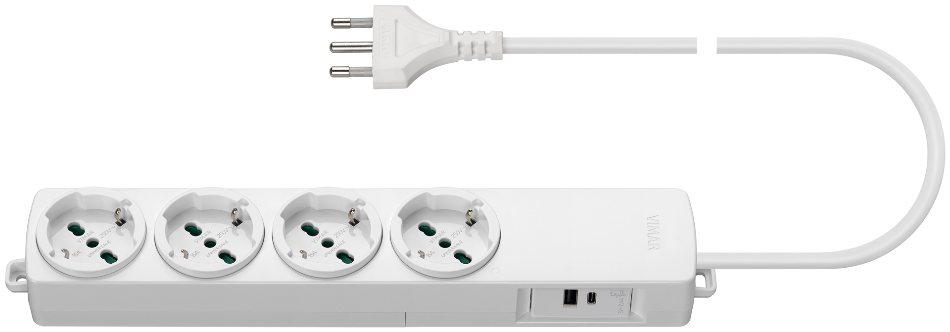 Presa mobile multipla 2P+T 16 A 250 V~, 4 uscite SICURY universale standard italiano tipo P40, alimentatore USB 12 W 2,4 A 5 V con 1 uscita USB tipo A e 1 uscita USB tipo C ottimizzate per caricare contemporaneamente 2 dispositivi (es. tablet, smartphone), cavo da 2 m con 3 conduttori da 1,5 mm2 (3G1,5), spina 2P+T 16 A standard italiano tipo S17, bianco