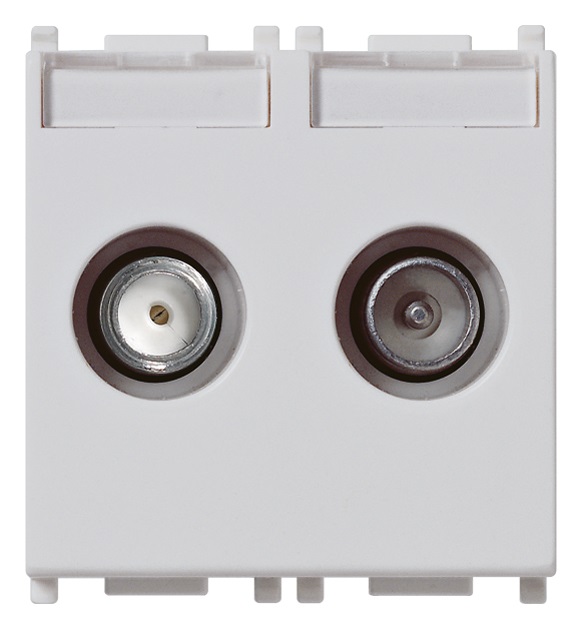 Presa coassiale TV-RD-SAT, 5-2400 MHz, diretta (derivata), demiscelata, 2 uscite con connettore maschio (TV-RD) e connettore tipo F femmina (SAT), attenuazione di derivazione 1 dB, Silver - 2 moduli. Permette il passaggio di corrente continua e segnali di controllo (24 V 500 mA max)