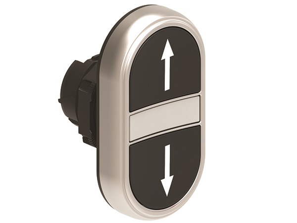 Operatore pulsante doppio ad impulso con indicatore luminoso bianco Ø22mm serie Platinum plastica cromata, con 2 pulsanti rasati. Entrambi ad impulso, nero - nero/↑ - ↓