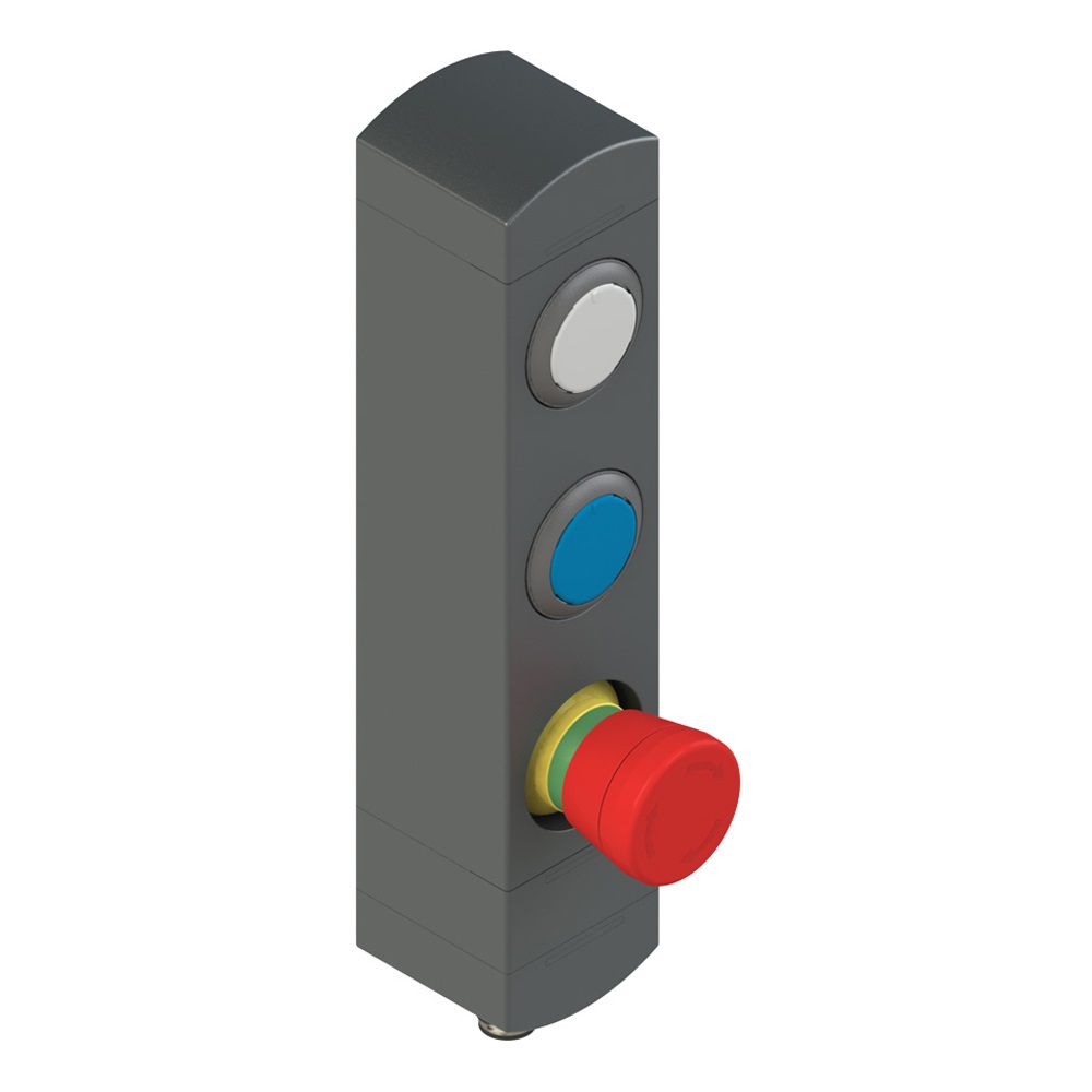Pulsantiera di comando serie BN, Numero di dispositivi: 3 dispositivi, Posizione 1: 1 pulsante bianco 1NO, Posizione 2: 1 pulsante blu 1NO, Posizione 3: 1 pulsante di emergenza rosso, sblocco a rotazione, 2NC, Grado di protezione: IP65 secondo EN 60529, Connessione e verso di uscita: Connettore M12 a 12 poli, in basso.