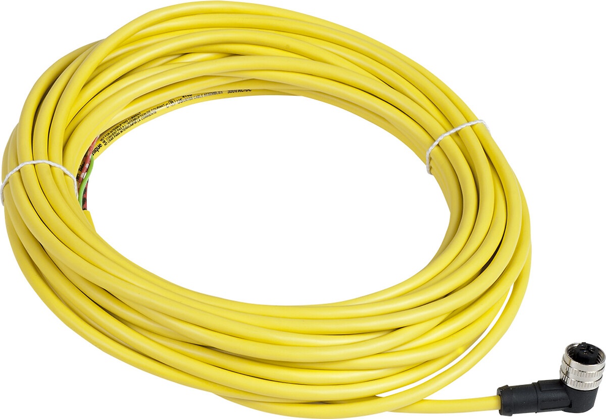Cavo elettrico con guaina in PVC di colore giallo, dotato di connettore femmina a 3 pin angolato a 90 gradi. Progettato per applicazioni di cablaggio in sistemi di sensori, garantisce affidabilità e facilità di installazione grazie alla sua struttura robusta e flessibile. Ideale per trasmissione di segnali elettrici in ambienti industriali.