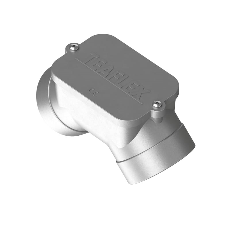 Curva a 90° in pressofusione di alluminio, coperchio laterale d'ispezione con bordino paraspruzzo e relativa guarnizione, viti di chiusura in acciaio inox AISI 304, filetto femmina - femmina, realizzate per facilitare l'introduzione, lo scorrimento e l'ispezione dei cavi IP65.
