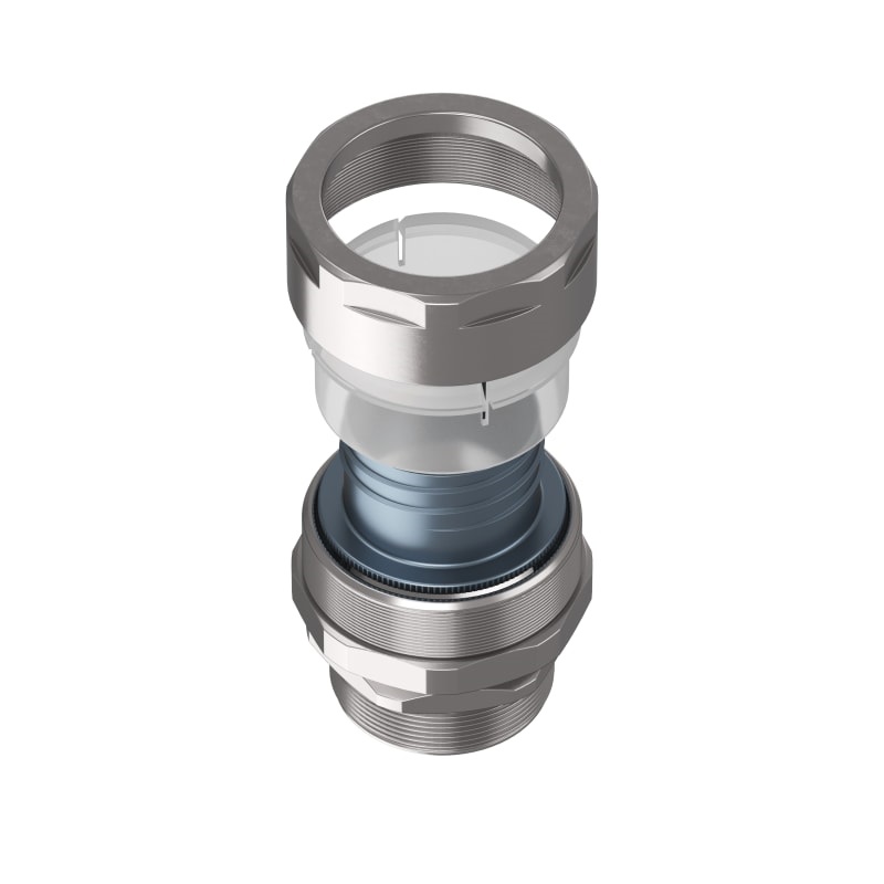 Il raccordo consente di effettuare tutti i collegamenti con le guaine metalliche tipo L - P - DAR - SVT - T - TP - LPU - DAPU e SVPEVAT in modo pratico, economico e sicuro. Il collegamento raccordo-guaina viene effettuato mediante una virola ed un anello in nylon. La particolare costruzione della virola consente l'avvitamento all'interno della guaina metallica, garantendo un abbinamento dotato di un'ottima resistenza alla trazione ed alla vibrazione, assicurando nel contempo una perfetta continuità elettrica. L'anello di nylon invece, bloccando esternamente la guaina flessibile, completa l'accoppiamento raccordo-guaina garantendo un grado di protezione IP67.