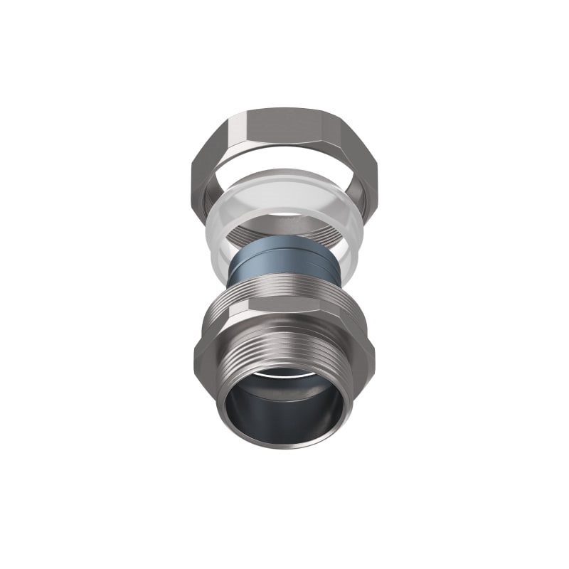 Il raccordo filetto maschio in ottone nichelato, permette il collegamento diretto tra le guaine NZ-DAN-SV-SVPEVA. Il collegamento raccordo-guaine viene effettuato mediante una virola ed un anello di nylon. La particolare costruzione della virola consente l'avvitamento all'interno della guaina metallica, permettendo di ottenere un abbinamento dotato di una ottima resistenza alla trazione e alla vibrazione. L'anello di nylon invece, bloccando esternamente la guaina flessibile, completa l'accoppiamento raccordo-guaina IP40.