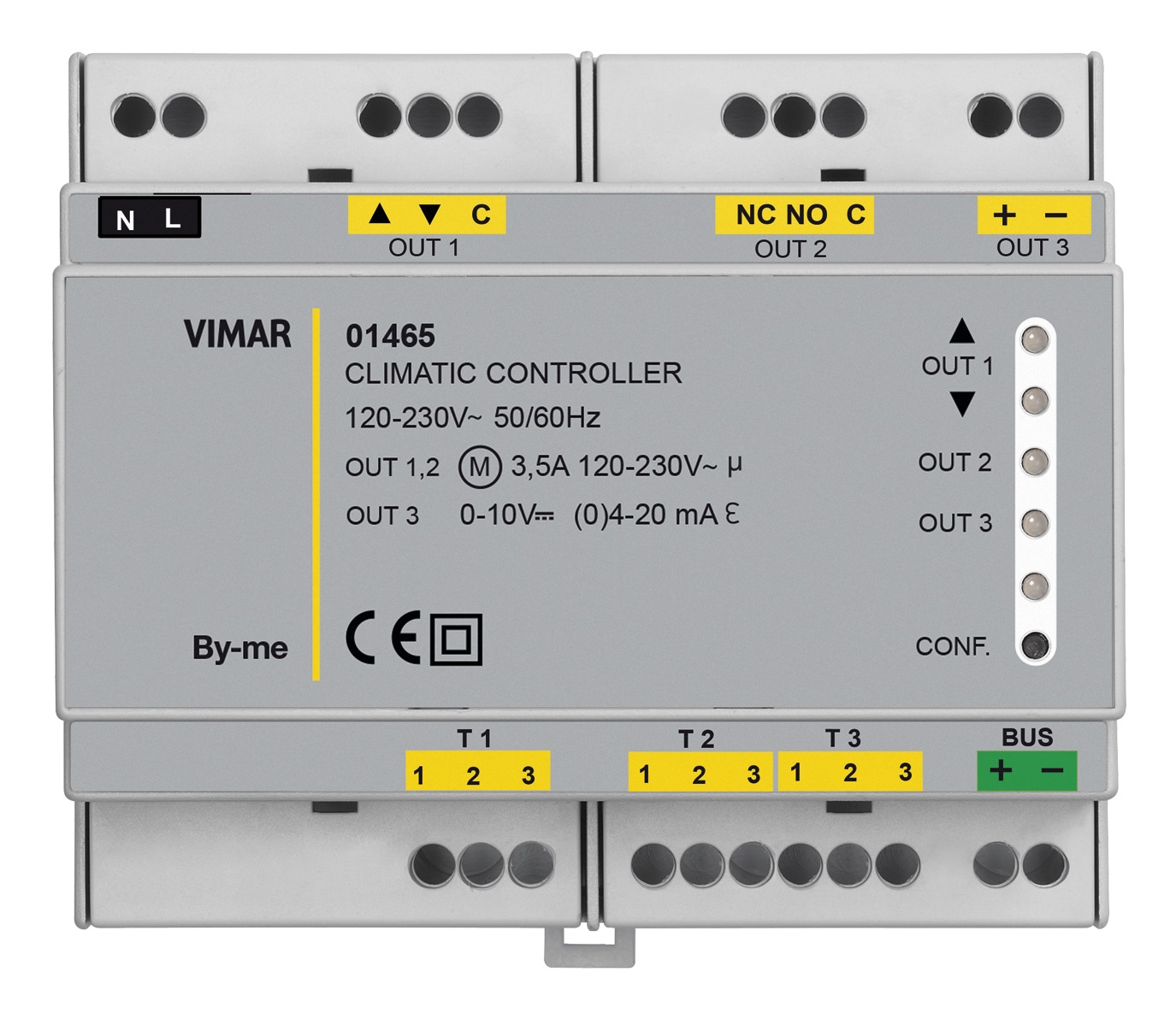 Regolatore climatico per impianti termici, dispositivo di controllo della temperatura di classe II (contributo 2%), alimentazione 120-230 V~ 50/60 Hz, 3 ingressi per sonde PT100, PT1000 e NTC, 1 uscita comando valvola miscelatrice, 1 uscita 0-10 V o (0)4-20 mA, 1 uscita a relè in scambio 8 A 230 V~, installazione su guida DIN (60715 TH35), occupa 6 moduli da 17,5 mm