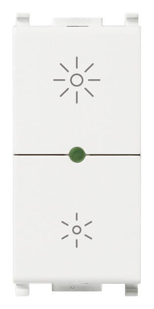 Dimmer universale 230 V~ 50 Hz a taglio di fase, per lampade ad incandescenza 40-400 W, trasformatori elettronici 40-300 VA, lampade CFL 10-200 W, lampade LED 3-200 W, per alimentatori elettronici LED a taglio di fase, comando ON/OFF e regolazione con pulsanti incorporati o da più punti con pulsanti NO, funzione MASTER per 14137, regolazione intensità luminosa minima, individuazione al buio, bianco. Apparecchio non installabile nei contenitori Isoset