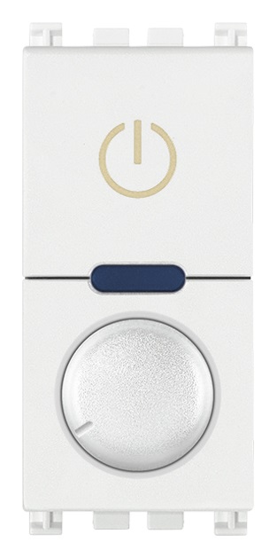 Dimmer universale 230 V~ 50 Hz a taglio di fase, per lampade ad incandescenza 40-400 W, trasformatori elettronici 40-300 VA, lampade CFL 10-200 W, lampade LED 3-200 W, per alimentatori elettronici LED a taglio di fase, comando ON/OFF con pulsante incorporato o da più punti con pulsanti NO, regolazione con potenziometro rotativo incorporato, funzione MASTER per 19137, regolazione intensità luminosa minima, individuazione al buio, bianco. Apparecchio non installabile nei contenitori Isoset