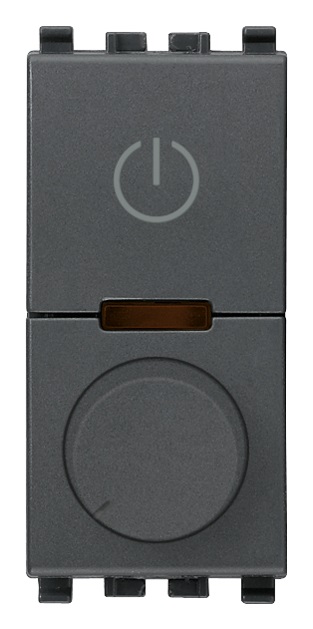 Dimmer universale 230 V~ 50 Hz a taglio di fase, per lampade ad incandescenza 40-400 W, trasformatori elettronici 40-300 VA, lampade CFL 10-200 W, lampade LED 3-200 W, per alimentatori elettronici LED a taglio di fase, comando ON/OFF con pulsante incorporato o da più punti con pulsanti NO, regolazione con potenziometro rotativo incorporato, funzione MASTER per 20137, regolazione intensità luminosa minima, individuazione al buio, grigio. Apparecchio non installabile nei contenitori Isoset