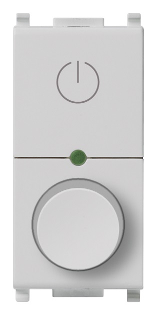 Dimmer universale 230 V~ 50 Hz a taglio di fase, per lampade ad incandescenza 40-400 W, trasformatori elettronici 40-300 VA, lampade CFL 10-200 W, lampade LED 3-200 W, per alimentatori elettronici LED a taglio di fase, comando ON/OFF con pulsante incorporato o da più punti con pulsanti NO, regolazione con potenziometro rotativo incorporato, funzione MASTER per 14137, regolazione intensità luminosa minima, individuazione al buio, Silver. Apparecchio non installabile nei contenitori Isoset