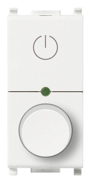 Dimmer universale 230 V~ 50 Hz a taglio di fase, per lampade ad incandescenza 40-400 W, trasformatori elettronici 40-300 VA, lampade CFL 10-200 W, lampade LED 3-200 W, per alimentatori elettronici LED a taglio di fase, comando ON/OFF con pulsante incorporato o da più punti con pulsanti NO, regolazione con potenziometro rotativo incorporato, funzione MASTER per 14137, regolazione intensità luminosa minima, individuazione al buio, materiale antibatterico, bianco. Apparecchio non installabile nei contenitori Isoset
