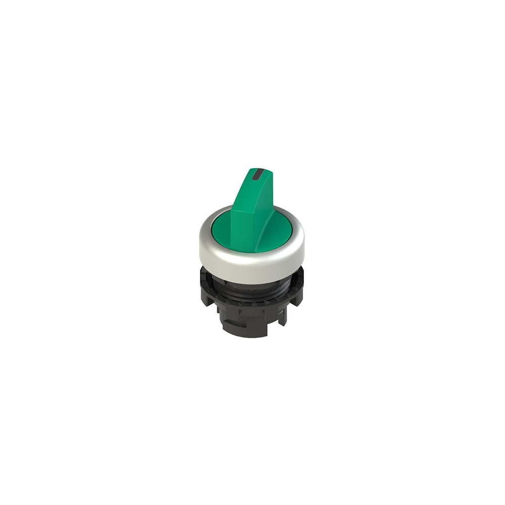 Selettore a leva corta a due posizioni verde con marcatura, Grado di protezione: IP67 secondo EN 60529 e IP69K secondo ISO 20653, Forma: A leva corta , Funzione: 2 posizioni, Colore: Verde, Ghiera: Cromo satinato, Marcatura: Con marcatura.