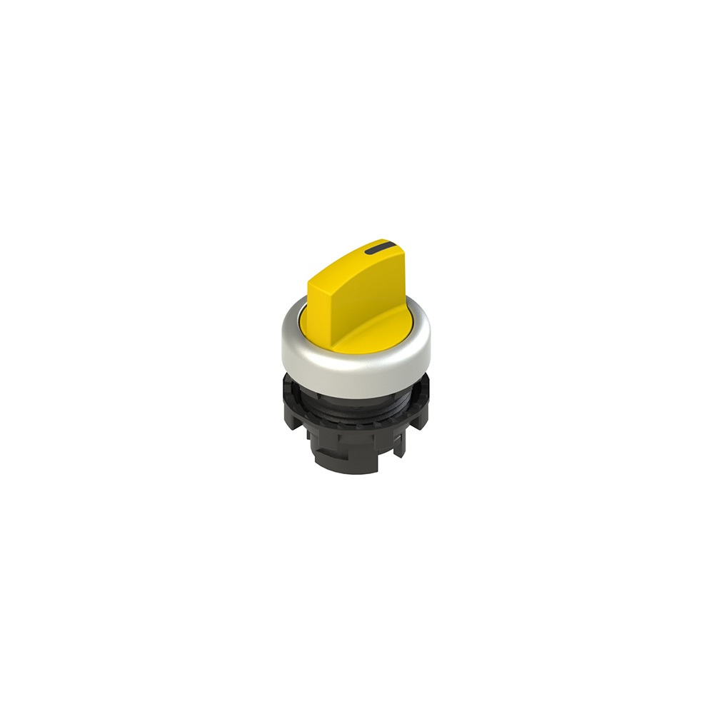 Selettore a leva corta a tre posizioni giallo con marcatura, Grado di protezione: IP67 secondo EN 60529 e IP69K secondo ISO 20653, Forma: A leva corta , Funzione: 3 posizioni, Colore: Giallo, Ghiera: Cromo satinato, Marcatura: Con marcatura.